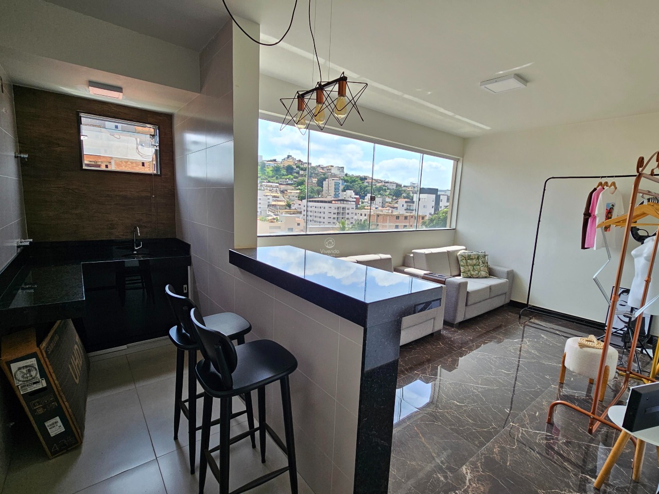 Living integrado com sala de jantar, estar, cozinha americana, lavabo e área externa.