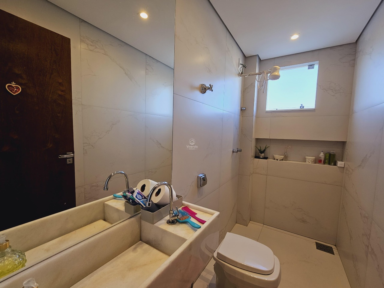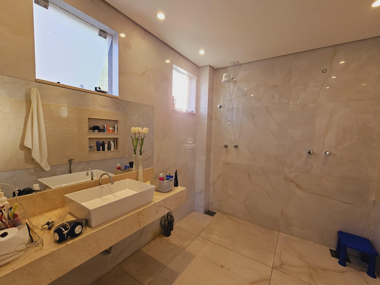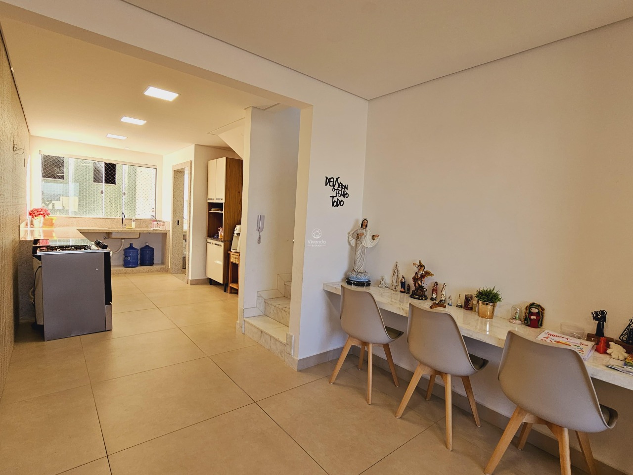 No 2º pavimento: Apresenta uma área gourmet completa, com cozinha equipada com armários, sala espaçosa, banheiro adicional e uma ducha, além de uma vista deslumbrante.