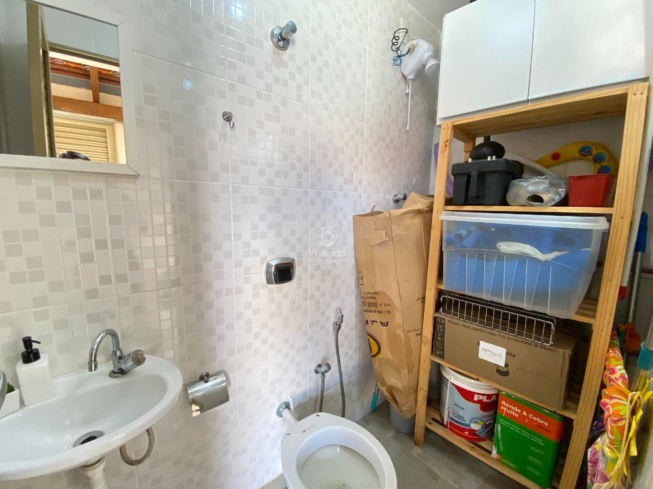 Armários planejados na cozinha e banheiro.