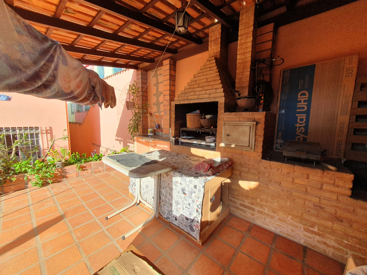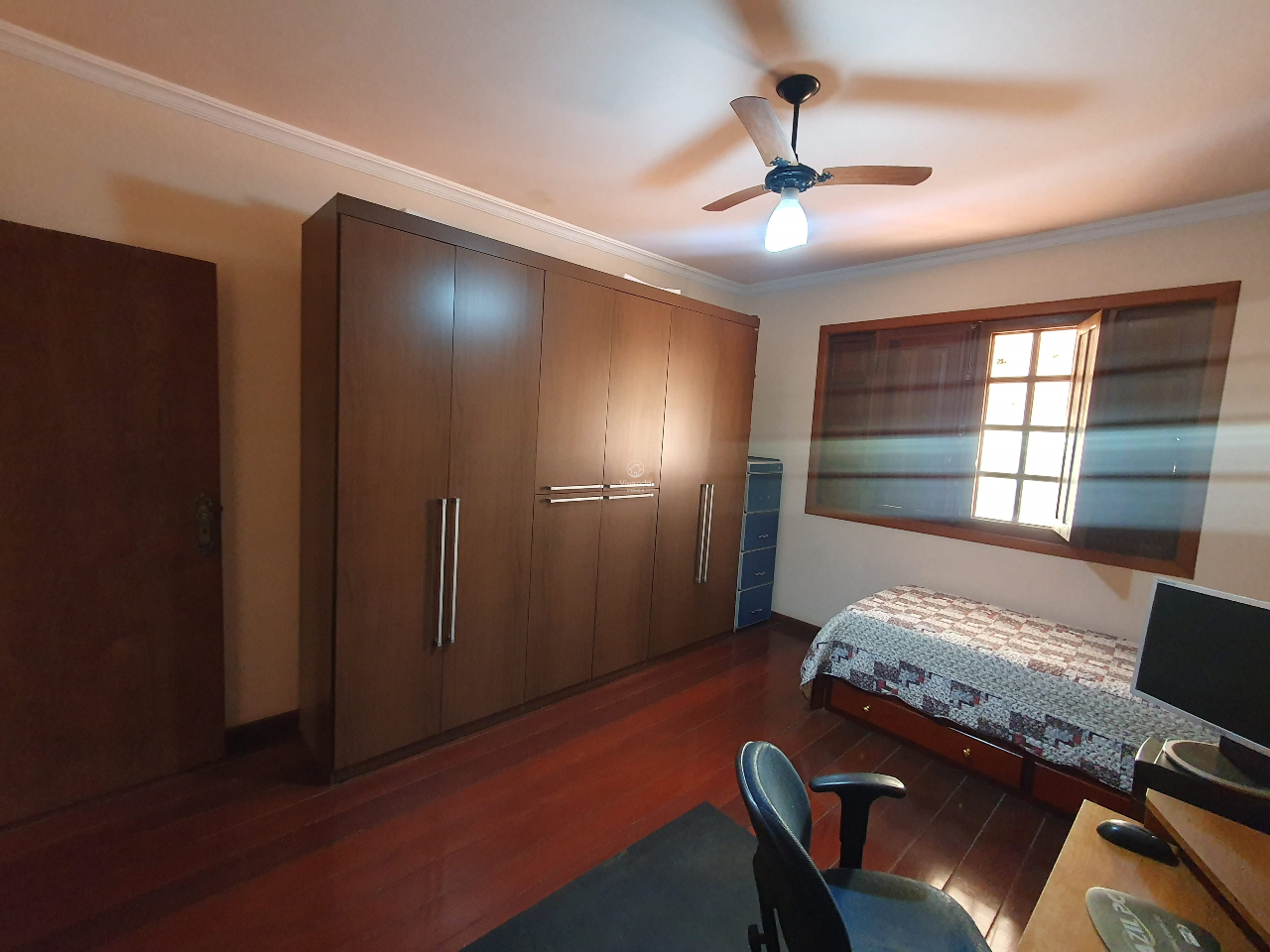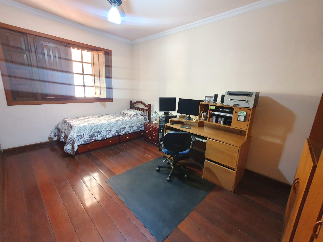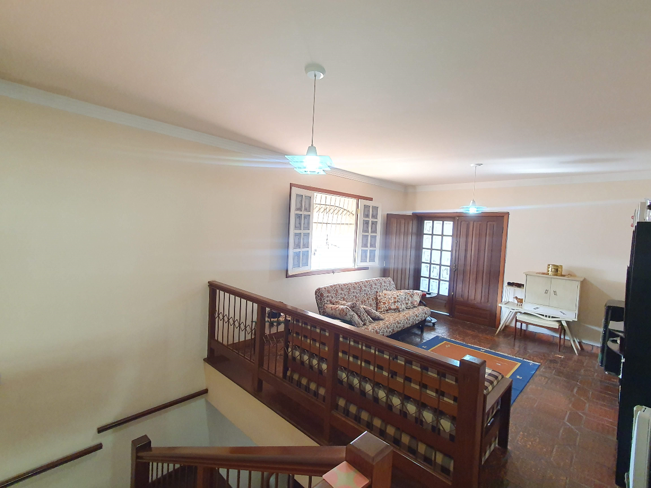 No pavimento superior, há uma sala, varanda, 3 quartos, sendo 1 suíte com closet, hall e banheiro.