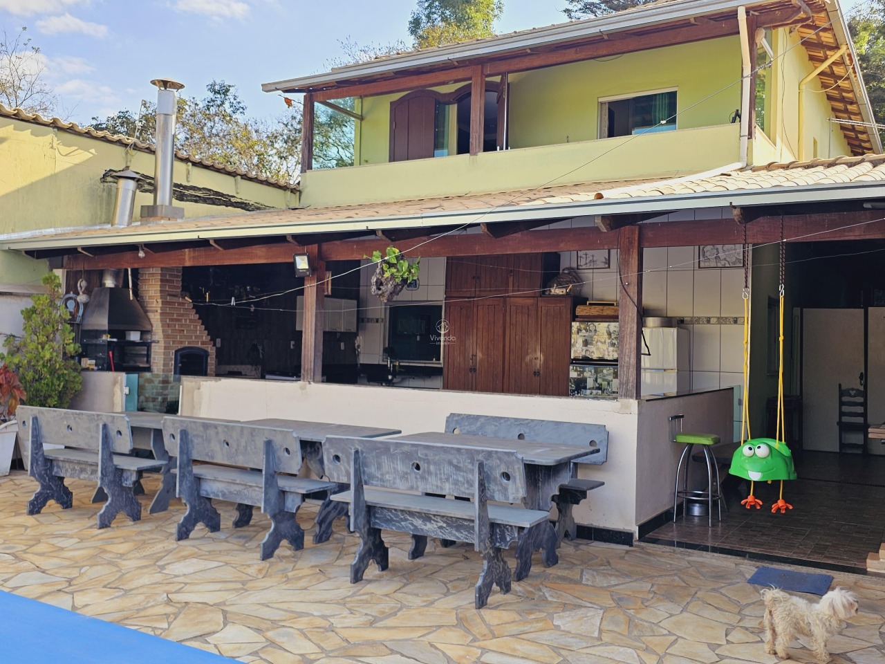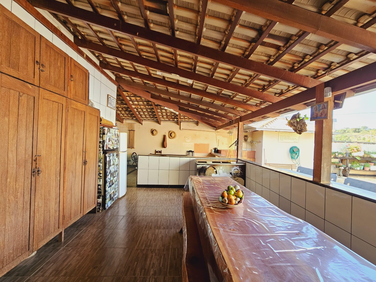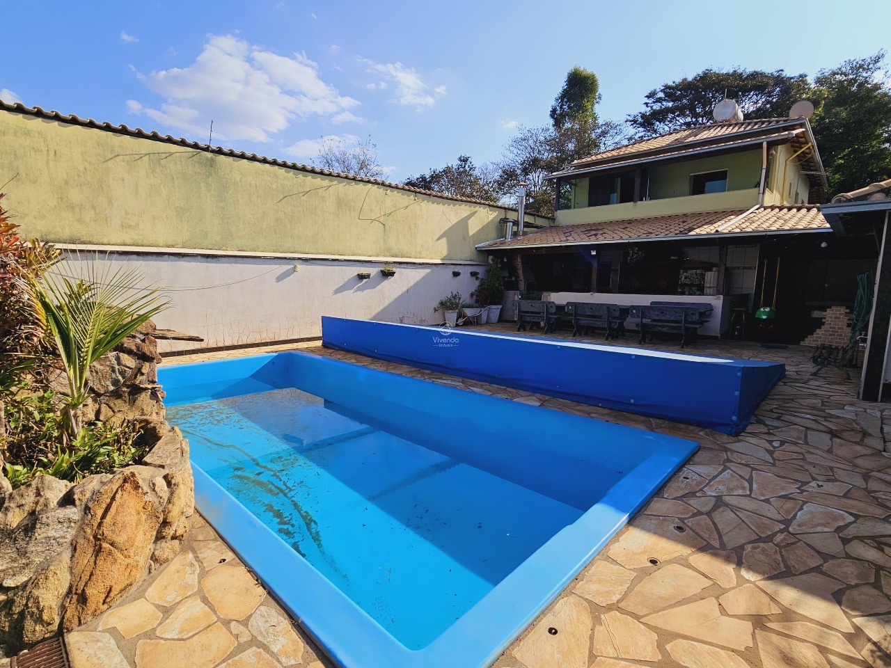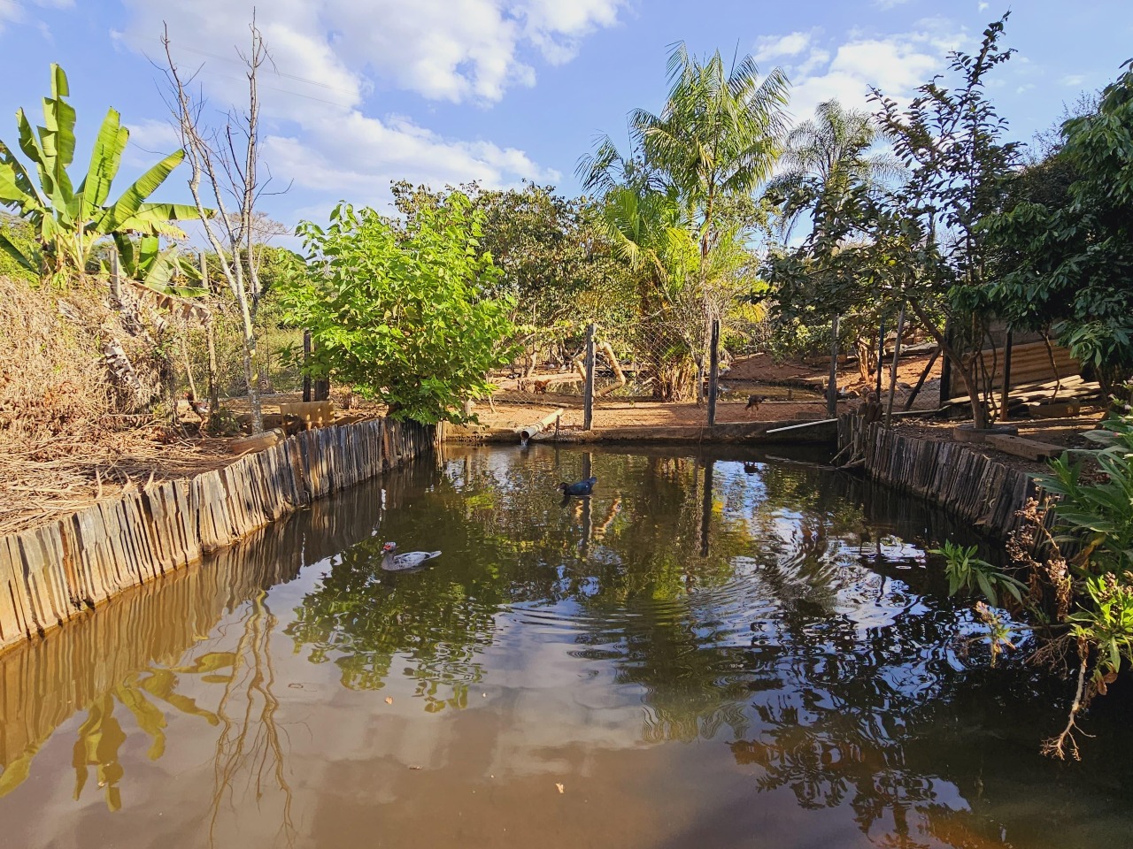 O imóvel apresenta um amplo espaço externo com área gourmet, piscina, lago artificial e árvores frutíferas.