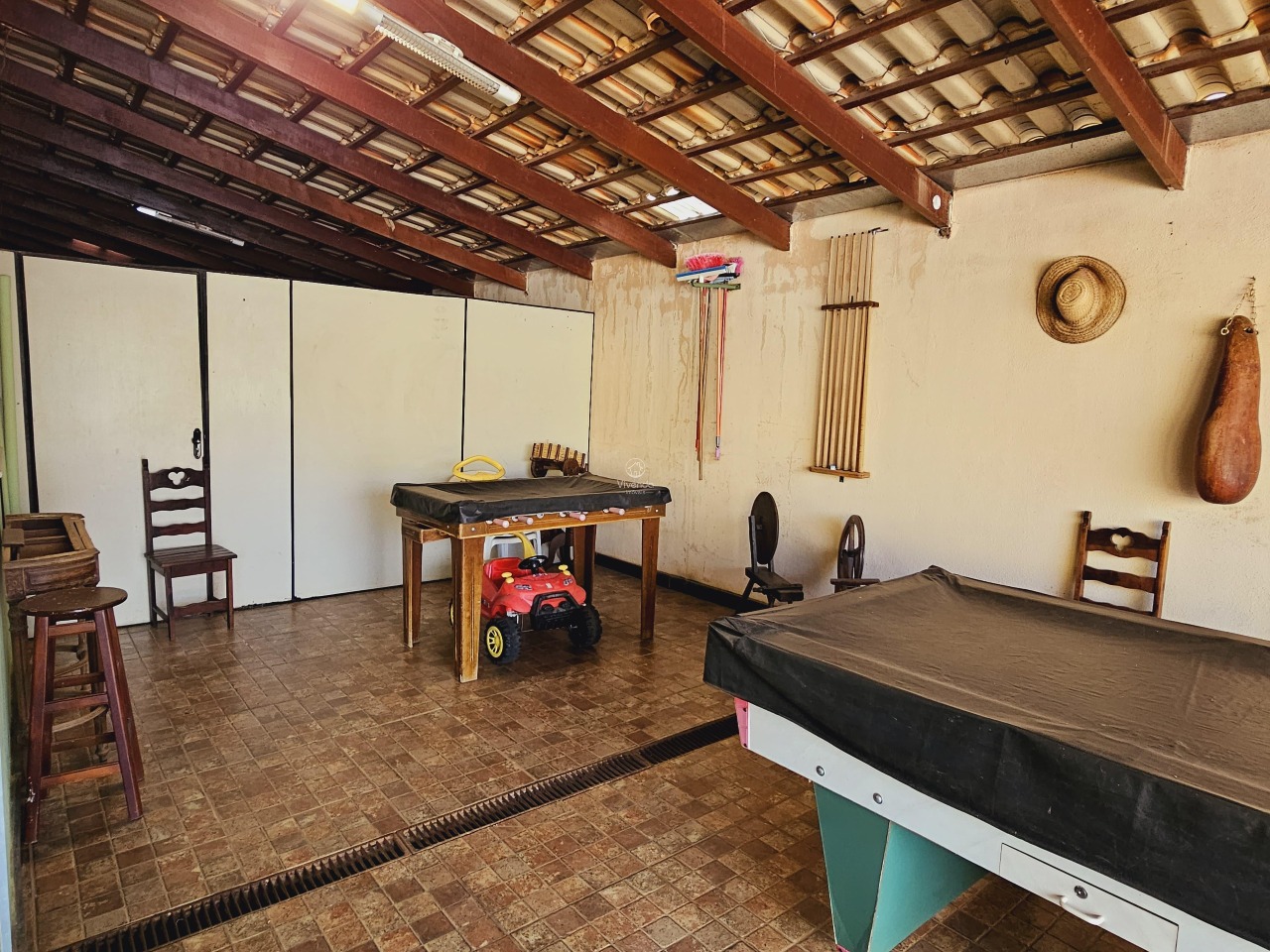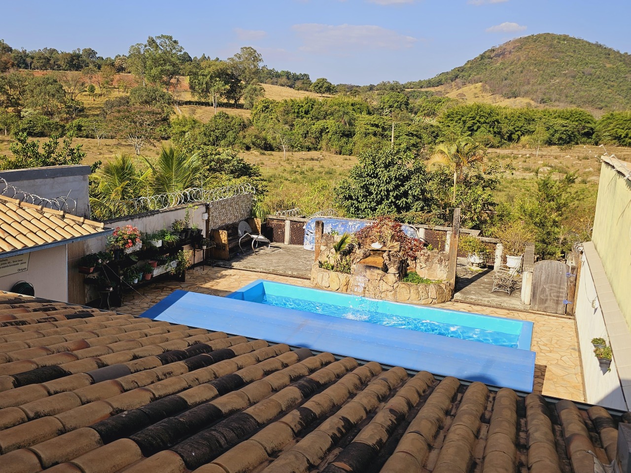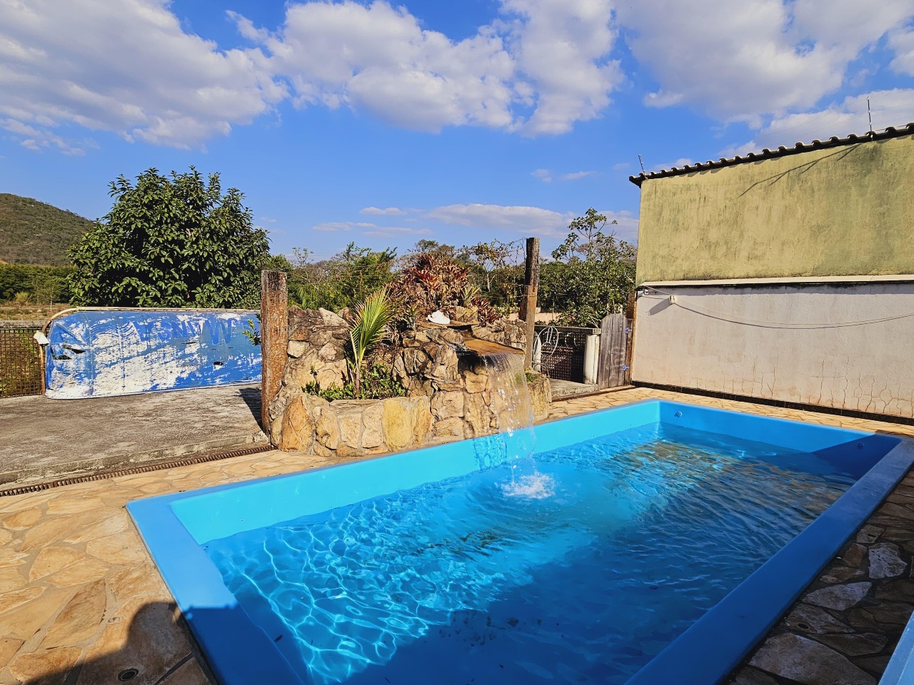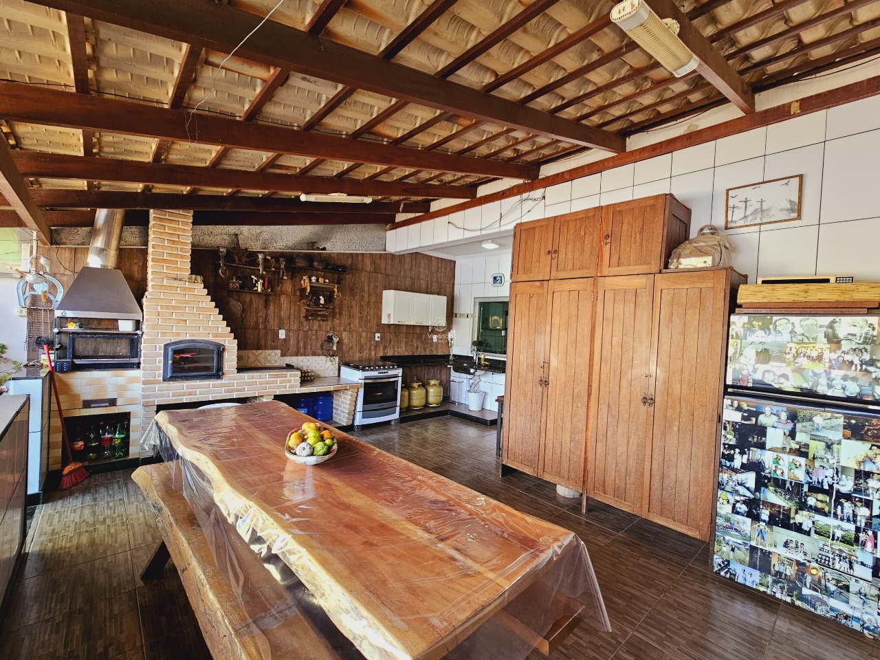 O imóvel apresenta um amplo espaço externo com área gourmet, piscina, lago artificial e árvores frutíferas.